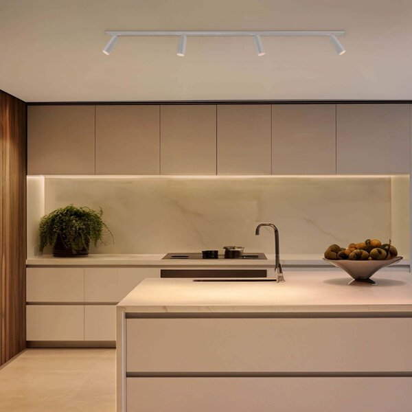 Este sistema de iluminación con rieles ofrece una flexibilidad inigualable y es fácil de adaptar o expandir con focos y rieles adicionales. Ideal, por ejemplo, para una galería de arte donde la iluminación debe moverse regularmente para nuevas obras de arte, o en la cocina donde se pueden añadir focos adicionales para una mejor iluminación de la encimera.