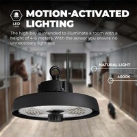 La lámpara LED UFO viene completamente equipada con un sensor de movimiento y luz diurna de 1-10V. Estos sensores aseguran que la iluminación se encienda solo cuando sea necesario, lo que ahorra significativamente energía y reduce la factura de electricidad. Este sensor tiene una distancia de detección de hasta 15 metros. Con la capacidad de ajustar el tiempo de activación, el sensor se puede adaptar a las necesidades específicas del espacio, garantizando un rendimiento y confort óptimos.