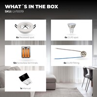 Los focos empotrables LED se entregan listos para usar. Los focos empotrables LED vienen con accesorios inclinables, focos GU10 atenuables de 3 W, accesorios GU10 y pinzas de soldadura. Con las pinzas de soldadura suministradas, los focos empotrables LED en el techo pueden conectarse con rapidez y facilidad a la red eléctrica de 230 V. Los focos empotrables LED tienen certificación IP20, siendo resistentes al polvo. Esto hace que los focos empotrables LED sean adecuados para áreas secas, como dormitorios, salones, áticos, etc.